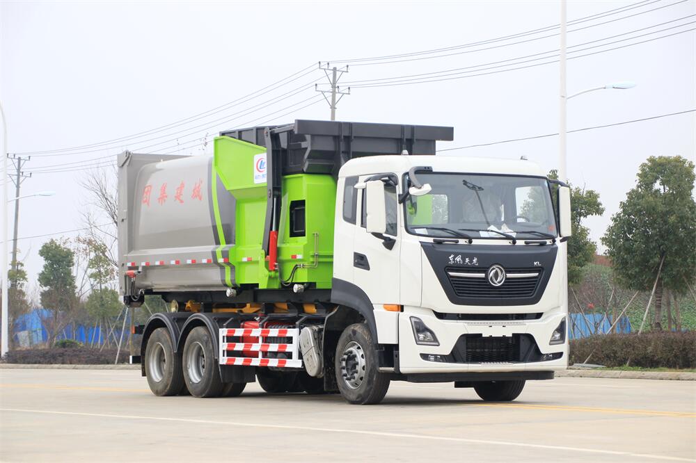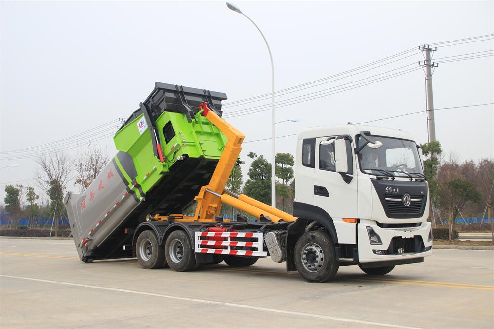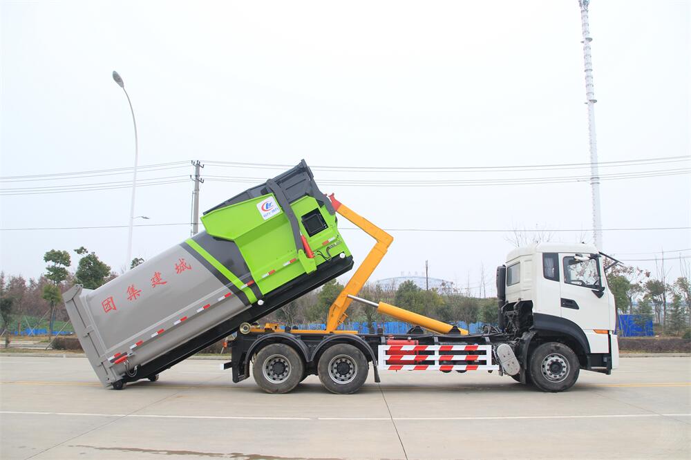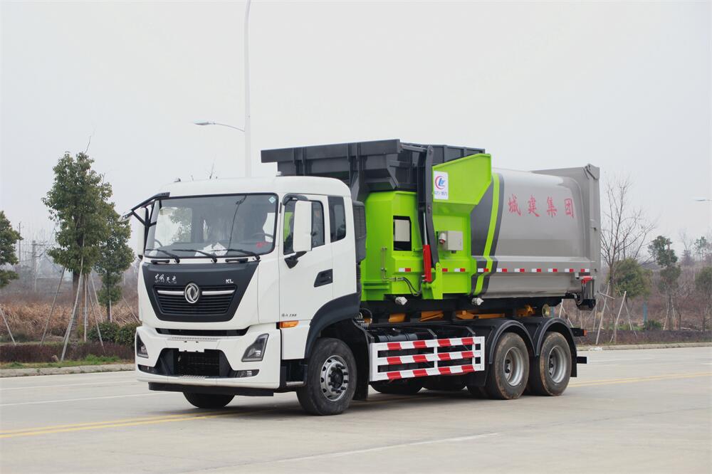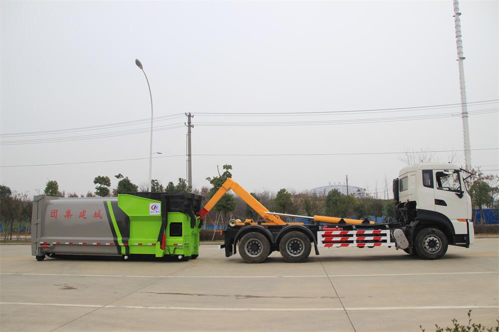 勾臂式垃圾車(車廂可卸式垃圾車)介紹: 車廂可卸式垃圾車又叫拉臂式垃圾車,是一種采用高新設計可伸縮的鉤臂,實現(xiàn)垃圾廂的二次吊裝,自吊上放下,可自行傾倒垃圾的環(huán)衛(wèi)設備。 拉臂式垃圾車結構簡單,操作穩(wěn)定方便,裝卸效率高,機械化程度高,節(jié)省人力。鉤臂垃圾車一車可帶多個垃圾廂,在裝卸的運輸過程中可有效地避免二次污染。 拉臂垃圾車采用高新設計可擺動的鉤臂,垃圾箱由框架、開啟油缸、滑輪、后門和若干加強框架與鋼板焊接而成。調(diào)換貨廂快捷方便,貨廂上帶蓋(倒垃圾時可翻開),鉤臂垃圾車垃圾廂體可選用碳鋼、不銹鋼材質(zhì)、內(nèi)部采取環(huán)氧樹脂防腐處理,改裝部分與原車底盤為可分離式,維修方便且保持了原車的機動性及行駛性能。